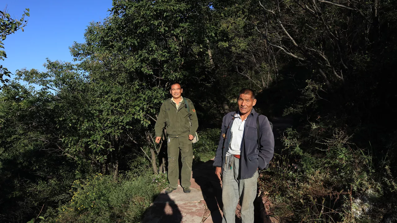 从九女峰到嶂石岩(邢台叫黄庵硇)走过的人不多,那里山高林密,下降攀升的幅度很大,基本是在山根和山石坠下的斜坡边缘穿行,且要绕过伸出的三个山头,再爬上一栈(离地面最近的那一层)走了5个小时。距离不清。两个向导在前面,我在后面边走边拍,拍了千余张图片。终点是河北省内丘县杏峪村。