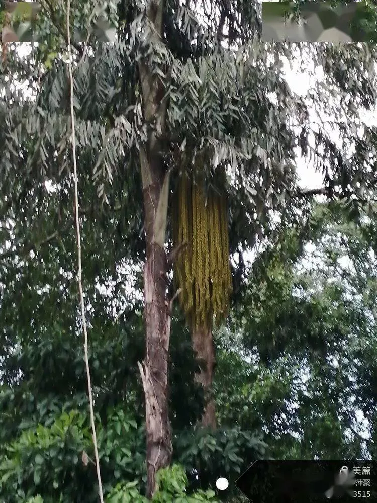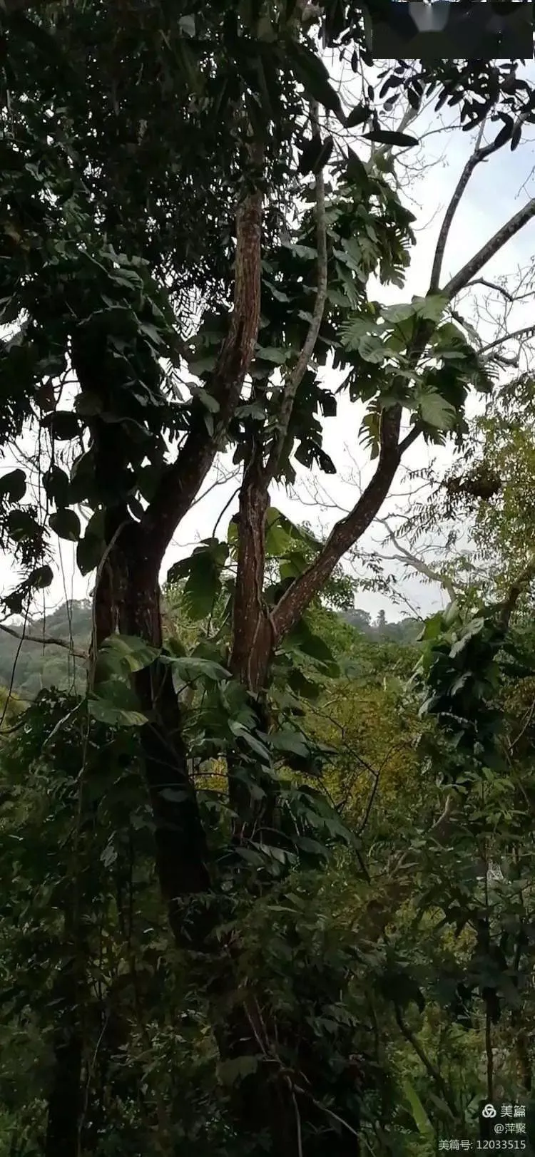 山上有一棵盘绕在树上的花卉—绿萝。我们家里盆养的绿萝,多少年能长成这样哦!