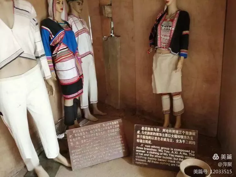 基诺族由乌优、阿哈、阿细,三个胞族组成。乌优胞族的服饰,主要以女帽和银泡为主。男子服饰则以黑色衣裤为主,全为手工织的布缝合而成。