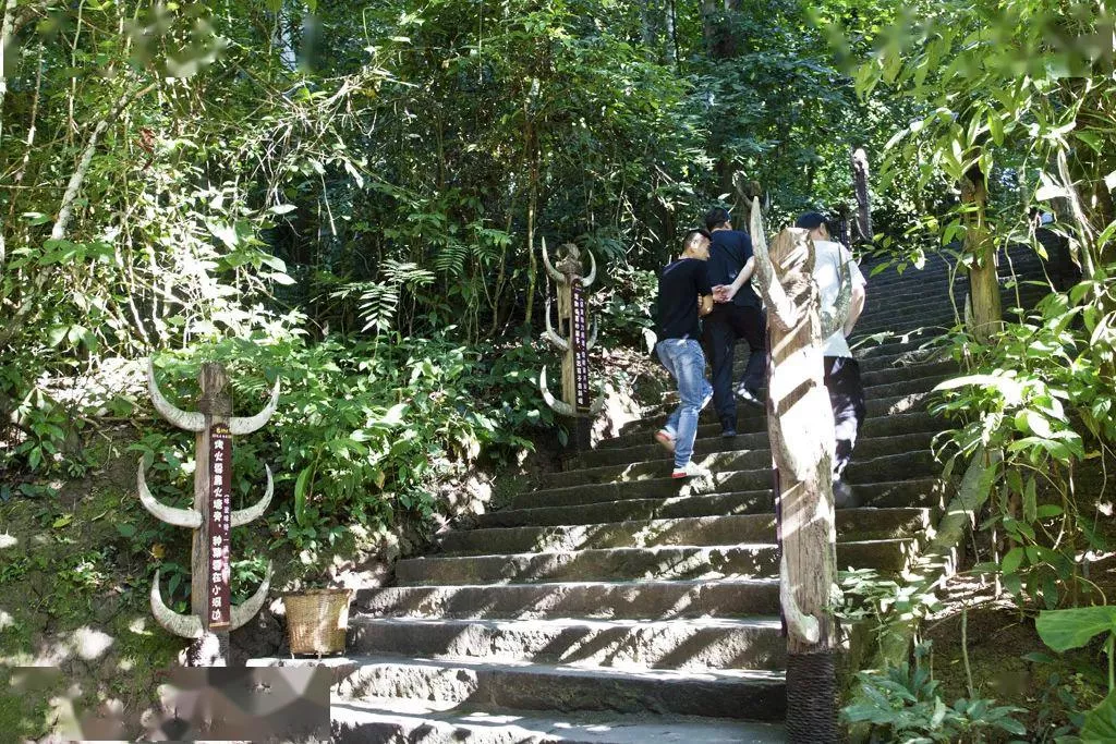 沿着山路,攀登近百级台阶,拾阶而上只见石路两边的树上、路边挂满了牛头,基诺族把牛头作为驱邪祈福的象征。铺在路边的牛头,是告诉人们现在他们生活的很好,牛头摆得越多生活越富裕。