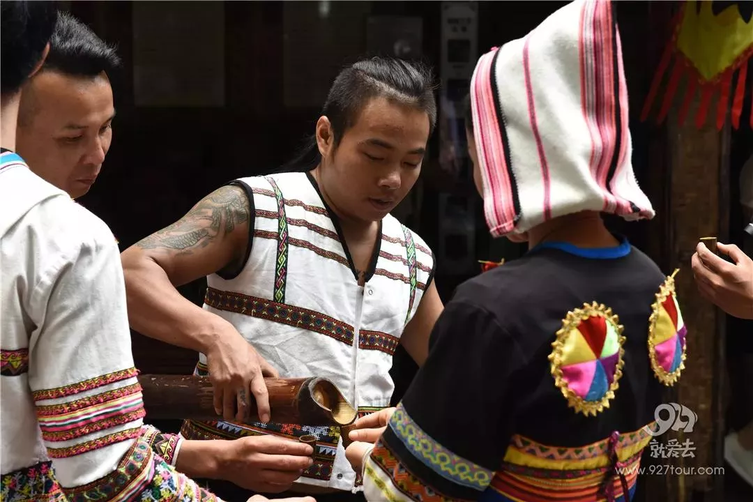 牛头路的尽头半山腰是一个大平台,基诺族老年穿着民族服装,手持竹筒,也是基诺族的民族乐器奇科、布姑。用这古老的乐器演奏着非常美妙的音乐,边敲边唱,迎接着客人们的到来。