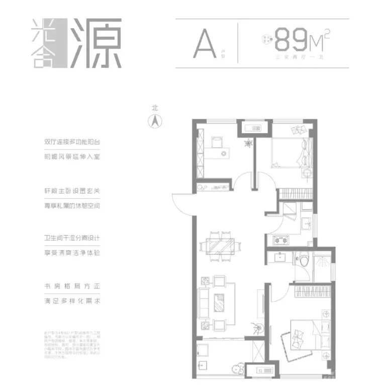 ▼扬州万科未来之光89㎡三室两厅一卫A户型图,是高层的户型。