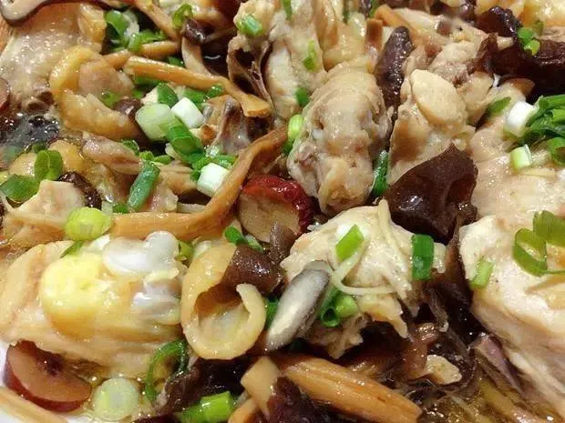 把鸡起片,用枣茸、冬菇粉蒸, 咸鲜软滑