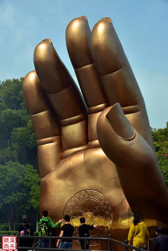 若想继续增加自身的威严和威力,那就再来参拜法力无边的天下第一掌。天下第一掌为灵山大佛右手的复制件,它与灵山大佛右手形状、大小完全一样,以1:1的比例复制而成。手掌高达11.7米,相当于三层楼的高度,总重量达13吨。佛掌的印相为“施无畏印”,寓意驱除众生痛苦,令众生无畏无惧。