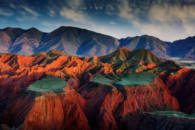 一条沟壑纵横、五彩斑斓的大峡谷,残阳如血洒在远处的天格尔雪峰上,翻滚的乌云下,羊群们埋头于蓝绿色的草坡之中,整个画面犹如《魔戒》所描写的“中土世界”。