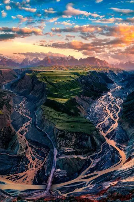 阔克苏河在其中蜿蜒而过,美成了一幅画