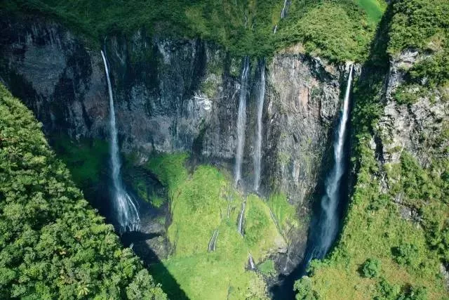 瀑布飞流,这里是绿色仙境。除了火山,岛上拥有令人惊叹的自然风光。山地中耸立着印度洋上的最高峰,也分布着火山喷发后形成的独特沉陷风蚀地貌――“冰斗”。