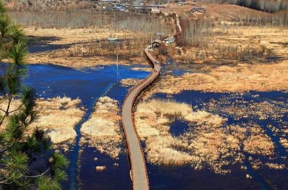 是草海芦苇丛中延伸出来的一座长达300米的木桥