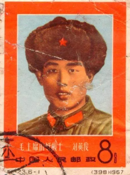 邮电部1967年发行的毛主席的好战士---刘英俊纪念邮票。1966年3月15日早晨,在佳木斯公共汽车站附近,他驾的车辕马被汽车喇叭声所惊,突然向人群冲去,这时有6个儿童吓呆了。在千钧一发的时刻,他把缰绳在胳膊上缠了几道,猛力一拉,使惊马前蹄腾空而起,紧接着他不顾自己生命危险,手撑辕杆,从辕杆下面用双脚猛跺马的后腿,马突然倒下,车翻了,6名儿童安然脱险。他却被压在翻倒的车马底下,身负重伤。