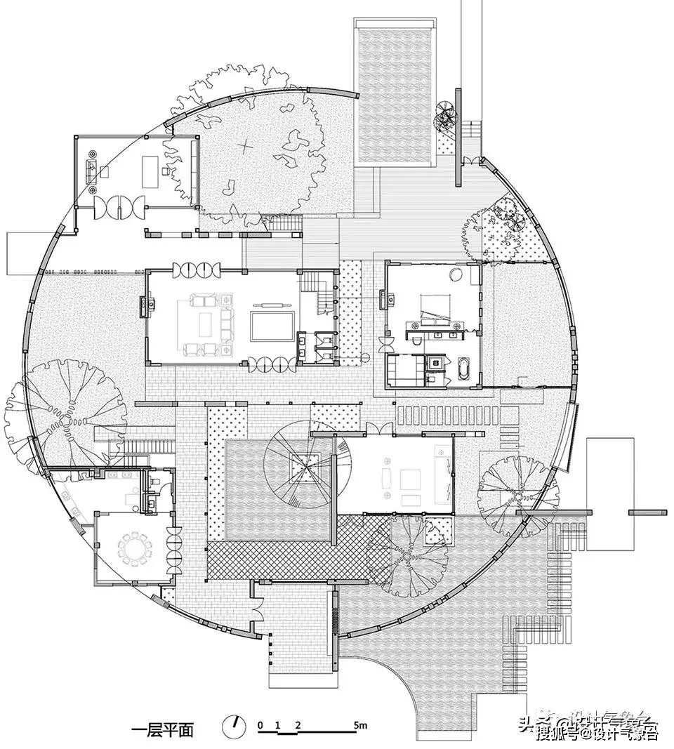 圆弧的围墙内部,安放着五栋方盒子建筑,精妙的布局,让内部格局不显拥挤,搭配有些年岁的香樟和楠木,外墙内院,转身停留,每一处皆是风景。