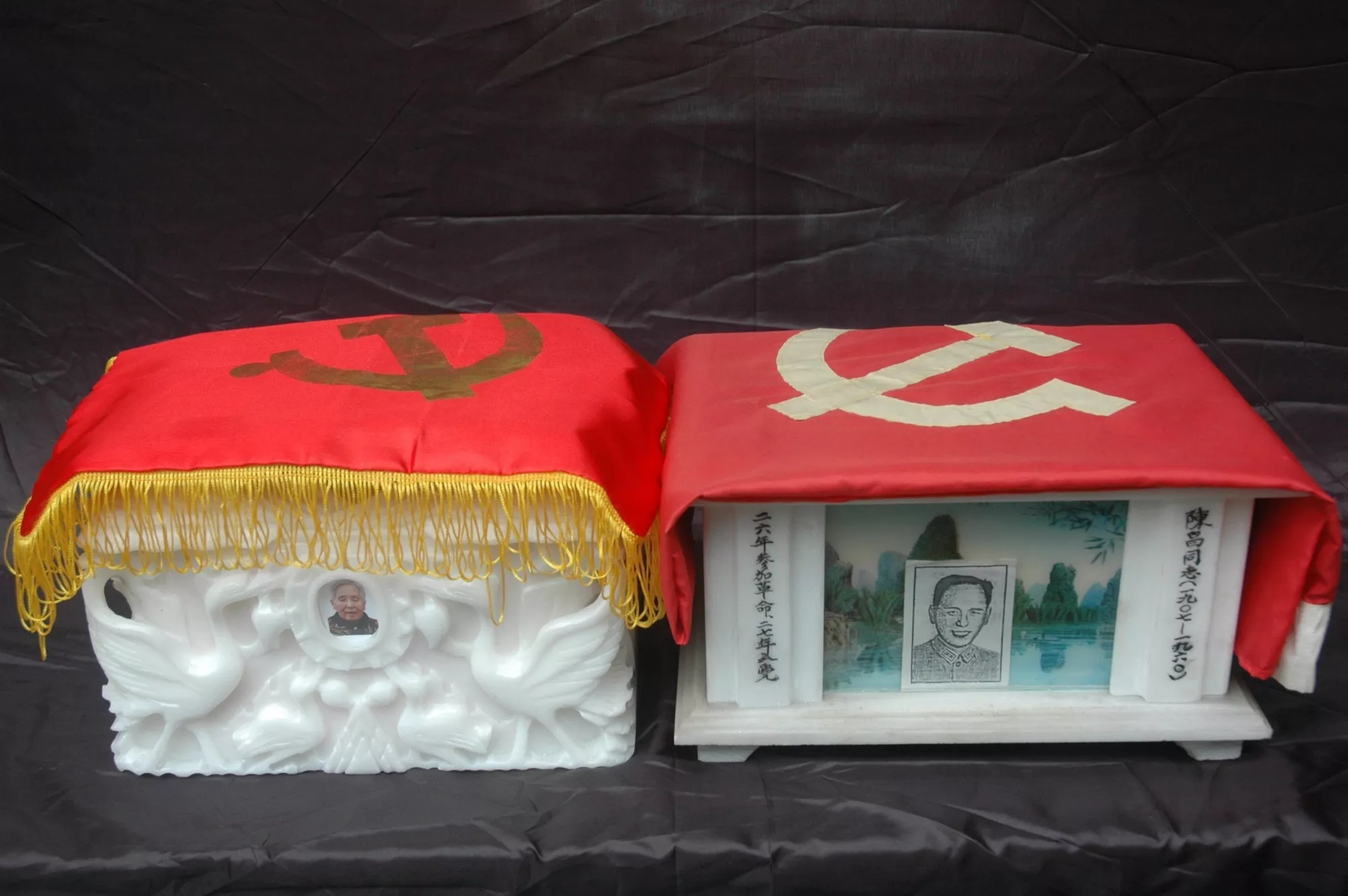 陈昌和何妨二位忠诚的老党员的骨灰盒上双双覆盖党旗,二老长眠在党的怀抱里继续她俩革命爱情