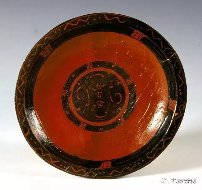 盛食器。旋木胎,盘内黑漆地上画三猫一龟,类似近代写生线条。猫用红漆单线勾勒,内涂灰绿色漆,朱绘耳、须、口、眼、爪、牙和柔毛,画面特别突出了猫大睁的双眼和长尾巴以及乌龟的长颈,形象颇为生动。三猫一龟的周围以红色和灰绿二色绘云纹。盘口沿朱绘几何图案。画面整体呈同心圆的形态向外扩展,构图讲究对称。龟代表长寿,在当时被视为一种祥瑞,与龙、凤、麟并称“四灵”。猫与龟的组合,反映了当时人们希望延年益寿的美好愿望。