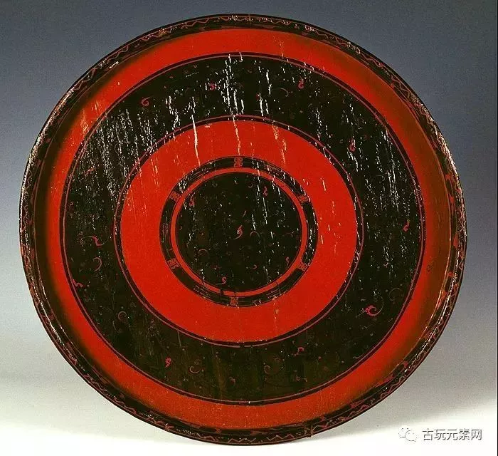 盛食器。旋木胎,盘内髹红漆和黑漆各二组,黑漆地上朱绘变体的云龙纹,并以漩涡纹组成龙的须角和鳞爪,口沿上为波折纹、点线纹,内外壁为鸟头形图案,整体笔法工整。外底朱书“轪侯家”。