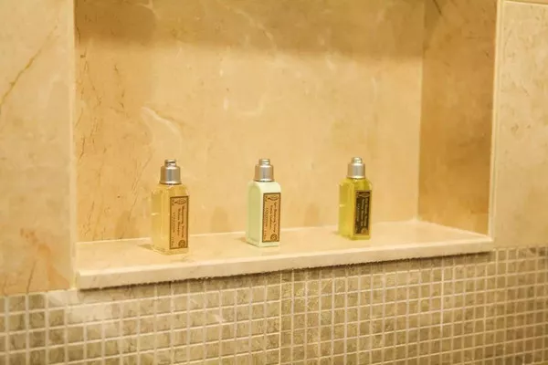 在庄园见山精舍里,有园主精心打造的一处日本禅意枯山水景,四周是一片竹林,这里分别有6套温泉别苑。四周青砖白瓦,竹编小灯悬挂于玻璃天顶之下,埋进圆形的浴缸里,水光盈盈,与头顶的灯光交相辉映。每个别苑的老门上有一个投影灯,墙上的“隐真”二字清晰可见。