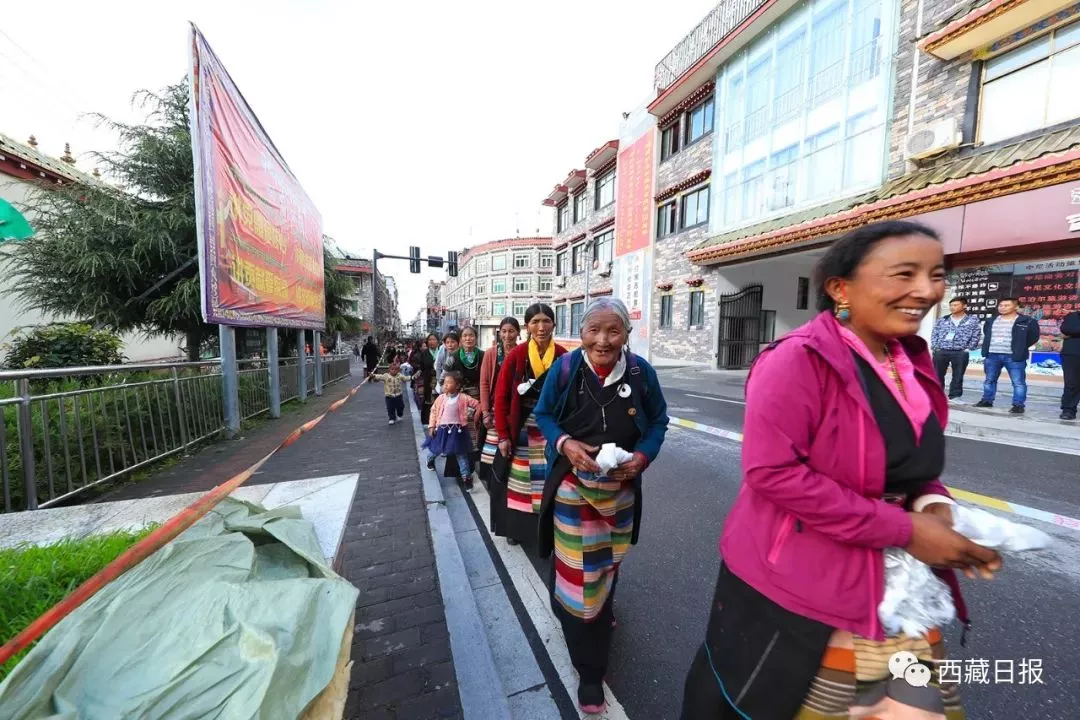 当地村民手捧哈达、点燃桑烟,自发来到村口送别十一世班禅大师。