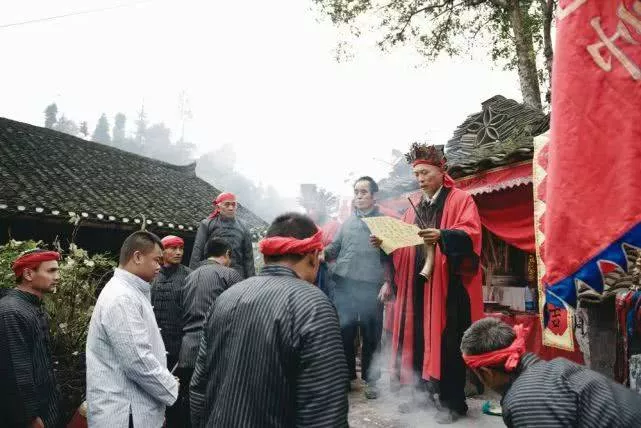 ◎ 湘西吕洞山一带苗族建房竖屋前,建房主人要请苗族祭司祭土地堂,以求家人和子孙平安兴旺。