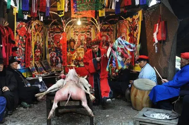 ◎ 巴代扎的祭坛建在堂屋中央,巴代扎做法事热烈奔放,跳绺巾舞驱鬼、娱神、请神,招式有车轮滚、扫尘、拜将、插巾、要四方、飞巾等动作,越到后头,舞姿越猛,还要口唱颂词与神灵沟通。