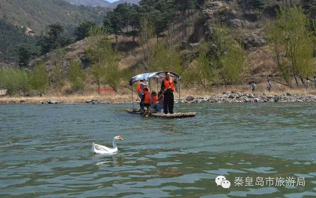 走到山脚下,就是可以划船和漂流的地方了。蟠桃峪的水清澈见底,我们分成两组,租了两条竹筏,男士们撑杆划船,亲力亲为,享受水中游船之趣,感受乡村的宁静和休闲。