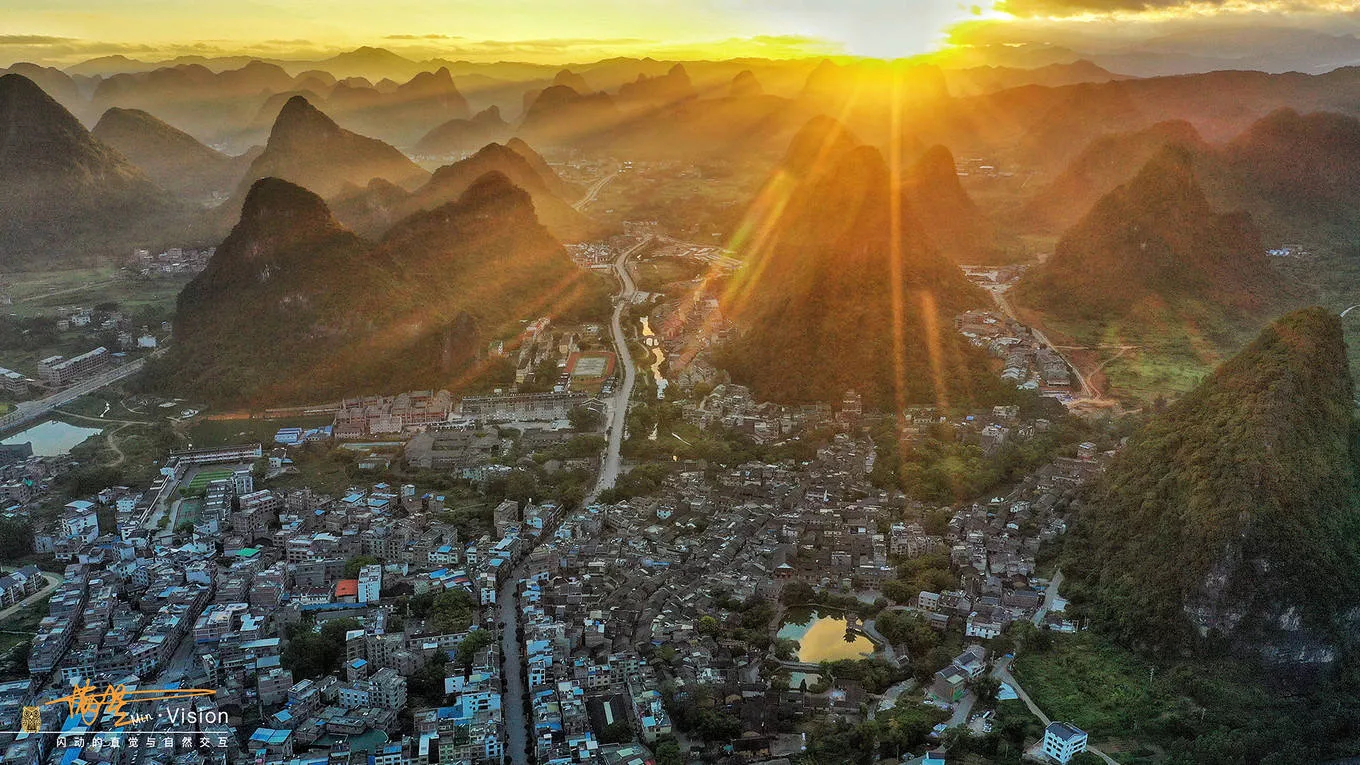 清晨6点起床,酒店门前起飞,天还蒙蒙亮,稍等几分钟就可以看到太阳初露的脸庞……黄姚的山一般在200-300米高度,飞行器飞到500米可以群山缭绕的感觉,但我更愿意调整角度,捕捉阳光透过群山洒向古镇的光束……(另,早5点出发开车上西边的一座山,可以开到山顶的一个森里客栈处,那里也是观日出最佳的方位,前景有茶山,还可以拍到漂亮的仙女湖)