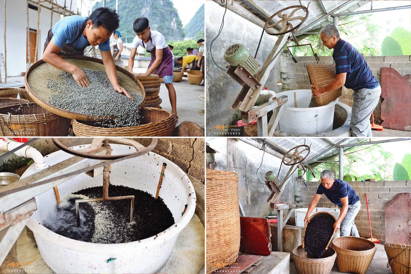 第三步:手工搓散发酵好的豆子,用天然古井的泉水清洗掉第一次发酵的青霉。