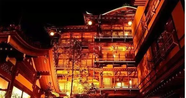 前面说到油屋原型其实参考了很多温泉旅馆,其中就有涉温泉金具屋。到了夜间这里四处洋溢着橘黄色的灯光,把整座建筑物映衬得金碧辉煌。