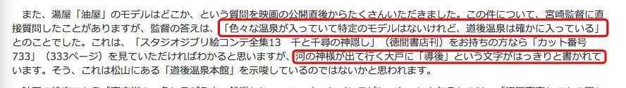在吉卜力官网的日志中也明确写道:关于油屋的原型,直接问过宫崎导演,导演回答说“参考了很多温泉,没有特定的原型,不过道后温泉确实是其中一个。分镜的脚本当中也写了很清楚的“道后”两个字。