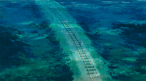 一望无际的海面上,列车穿行而过,带着千寻远去……
