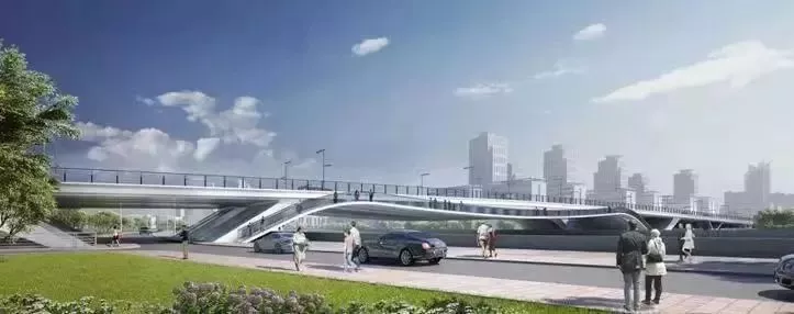 淀浦河桥主要的车行流线由优雅动感的上层空间提供,主跨两侧下置轻巧起伏的步道供开放空间人行通过,将市政桥属性和人行桥属性有效地整合在一起。
