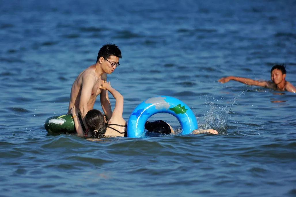 时节过了夏至,就是盛夏季节了。号称“20度”的青岛,也有点快挺不住了,气温已经高达29度。在金沙滩海水浴场,周末涌入众多游客和市民前来戏水纳凉。满眼美景令人眼花缭乱,下面就随小编的镜头看过来。图中一位小伙子牵着女友的手,在海水中漫步,这个情景,估计所有的小伙子都乐意去做的。