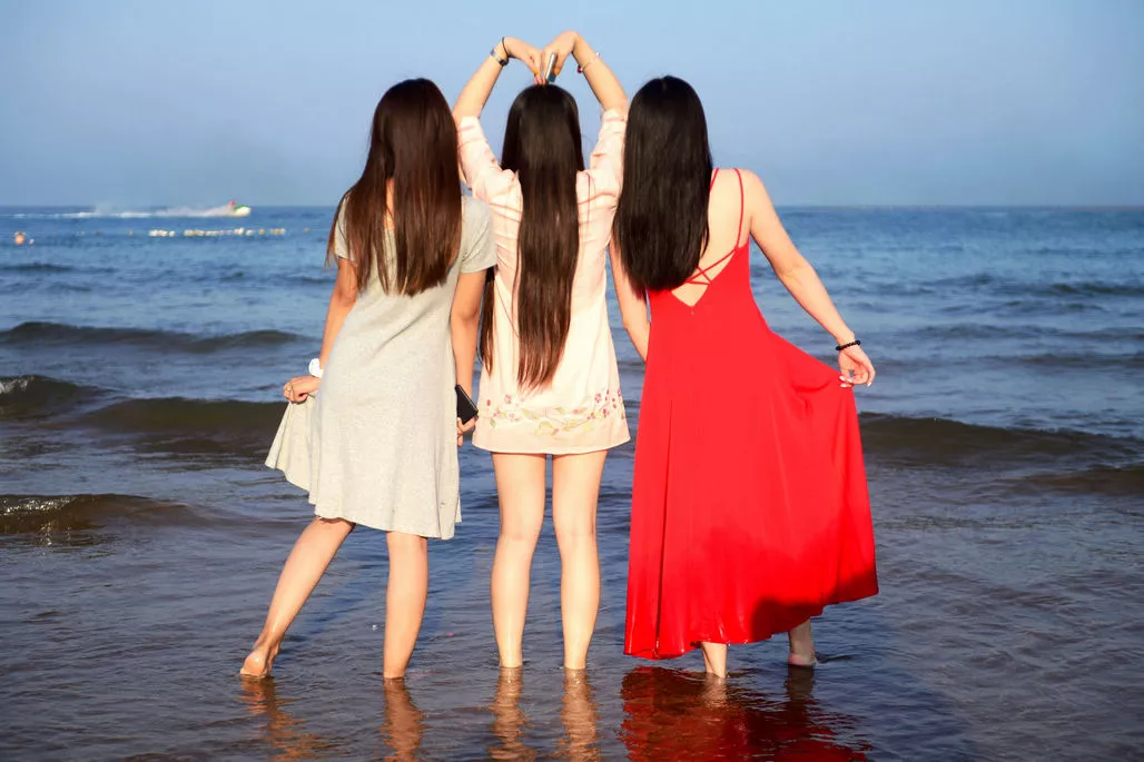 也有几位美女小伙伴一起在海边拍摄各留念照的,这3位美女让小伙伴来张背影照,也很不错。
