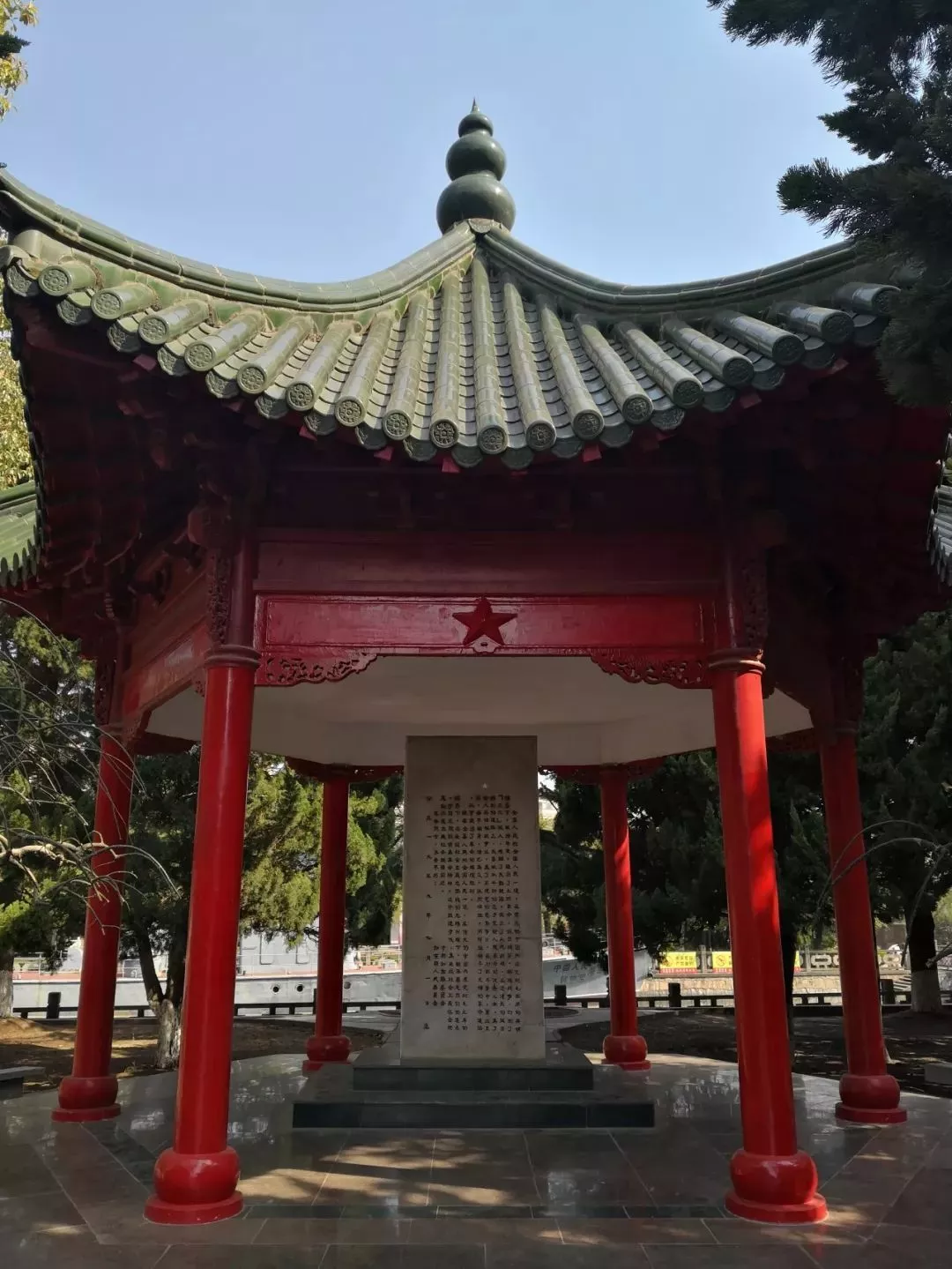 烈士墓后的纪念亭,与烈士塔遥相呼应,六角尖顶,绿色琉璃,红色廊柱。亭内正中立有2.2米高的大理石碑,洁白如玉。碑身用隶书镌刻着中共如东县委员会、县人民委员会攥写的碑文。亭畔数十棵树龄60余年的龙柏和7米多高的棕榈,郁郁葱葱,终年长青。