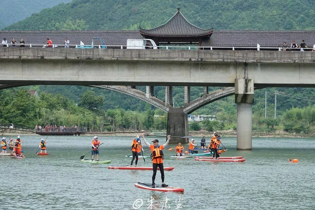 富阳首场水上巨无霸对抗赛也在沸腾坝上火热开赛。来自各地的水上运动爱好者在水面上搭乘“巨无霸”,即龙舟板开展团体角逐,决出胜负。