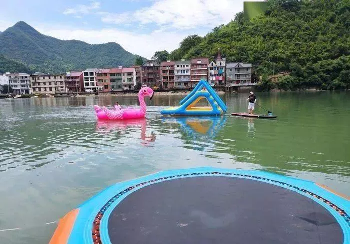 沸腾坝边的田更园亲子农场也开拓了不少水上项目供游客体验。“水上亲子皮划艇、水上足球等,都是很适合夏日的清凉玩法。农场内还有迷你棒球、软式飞碟、龟兔赛跑等趣味游戏可换换口味。”田更园负责人吴大尧说。