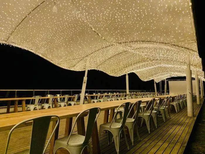 在星空灯下、敞开式的“云顶餐厅”中,自助餐也将开始。这里能同时接待200多人用餐,海鲜、肉类、甜点、饮料,任你选择。营地内还提供自助烧烤。地道的炭火炉、新鲜的食材,还有从东北聘请来的专职烧烤大厨。