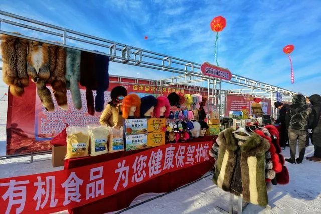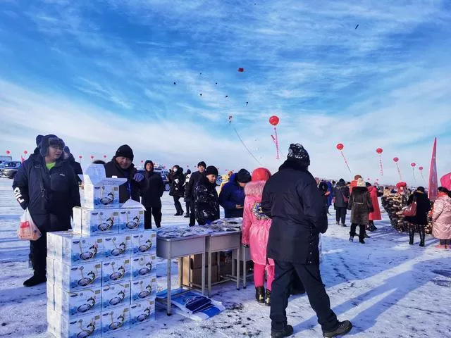 湖水冻鱼的冰景,冰冻的大鱼身上贴着逢年过节会贴的“福”字,象征吉祥好运的头鱼,2888条胖头鱼被冻成一条“船”,成群结队的鲤鱼、鳙鱼、鲫鱼被渔民从一个小小的冰洞中拽出,捕出的部分鱼现场就被煮出新鲜鱼汤,可以免费品尝,快递也有专区设了专门的场地也有优惠活动。