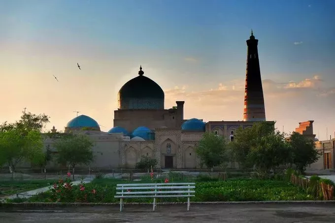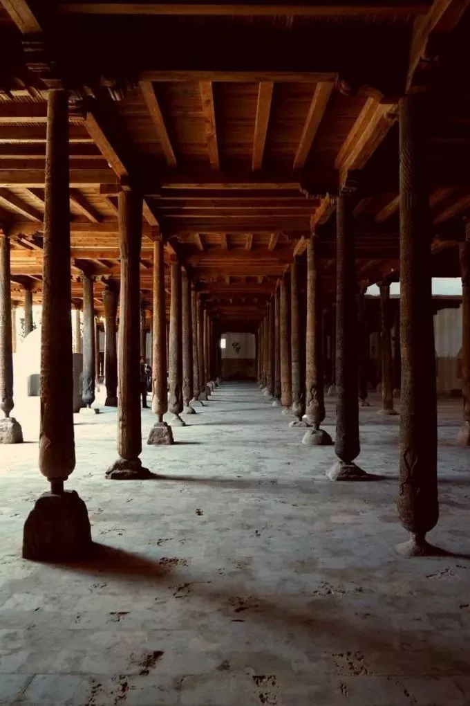 建于18世纪的主麻(Juma)清真寺,是希瓦最著名的景点之一。它的建筑风格十分奇特,屋顶由218根木柱支撑,沿着台阶往上就能到达Juma宣礼塔。