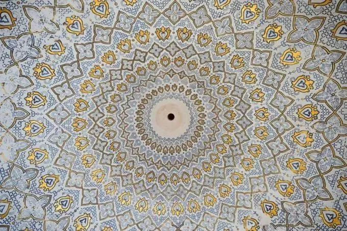 夏伊辛达陵的每座建筑装饰风格各不相同,内部的穹顶或是蓝色拼花、或是金线雕缕、又或是纯粹以立体空间结构取胜。越往里走,外墙的那些蓝色瓷砖装饰则愈发炫目,仿佛置身于蔚蓝色的海底世界一般。