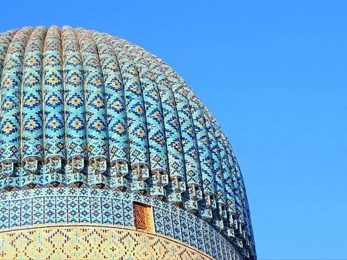 撒马尔罕还有着一座举世闻名的建筑,这便是被称为世界三大清真寺之一的比比哈努姆清真寺。长途跋涉,越过茫茫沙漠,当时的商旅们到达撒马尔罕时,首先映入眼帘的,便是这座巨型建筑物。这座清真寺以帖木儿的王后名字所命名,在其入口处刻了两个词:分别是出自可兰经的伟大与唯一。相传在几公里之外都能看见这两个词。这座清真寺也是全中亚地区最大的建筑物,长140米,宽100米,仅是正门的高度,就有35米之高。这座清真寺为帖木儿的王后在帖木儿征战印度时所建,帖木儿班师回国后嫌其太小,又下令重建,可直到其逝世,比比哈努姆清真寺也没有重建完成。重建到一半的清真寺经常会出现砖石掉落的情况,当地人甚至将其称为“永远不可能完成的建筑。”事实上,比比哈努姆清真寺确实也是在勉力支撑。终于,在1897年的一场地震之中,比比哈努姆清真寺轰然坍塌。如今游客们所能看到的比比哈努姆清真寺,只是原地重建的复制品。
