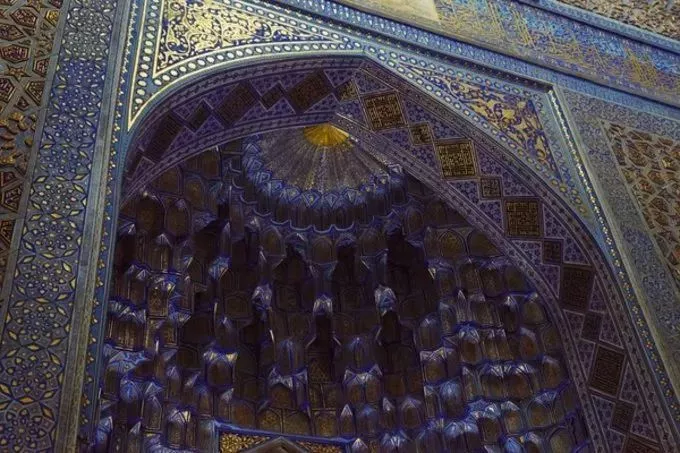 至于中间的Tillya Kari经学院,你必须走进里面去——然后你就知道为何它会冠以黄金之名(Tillya Kari意为“顶部用黄金覆盖”),大厅内部的由金叶交织成的辉煌穹顶让人目眩神迷。