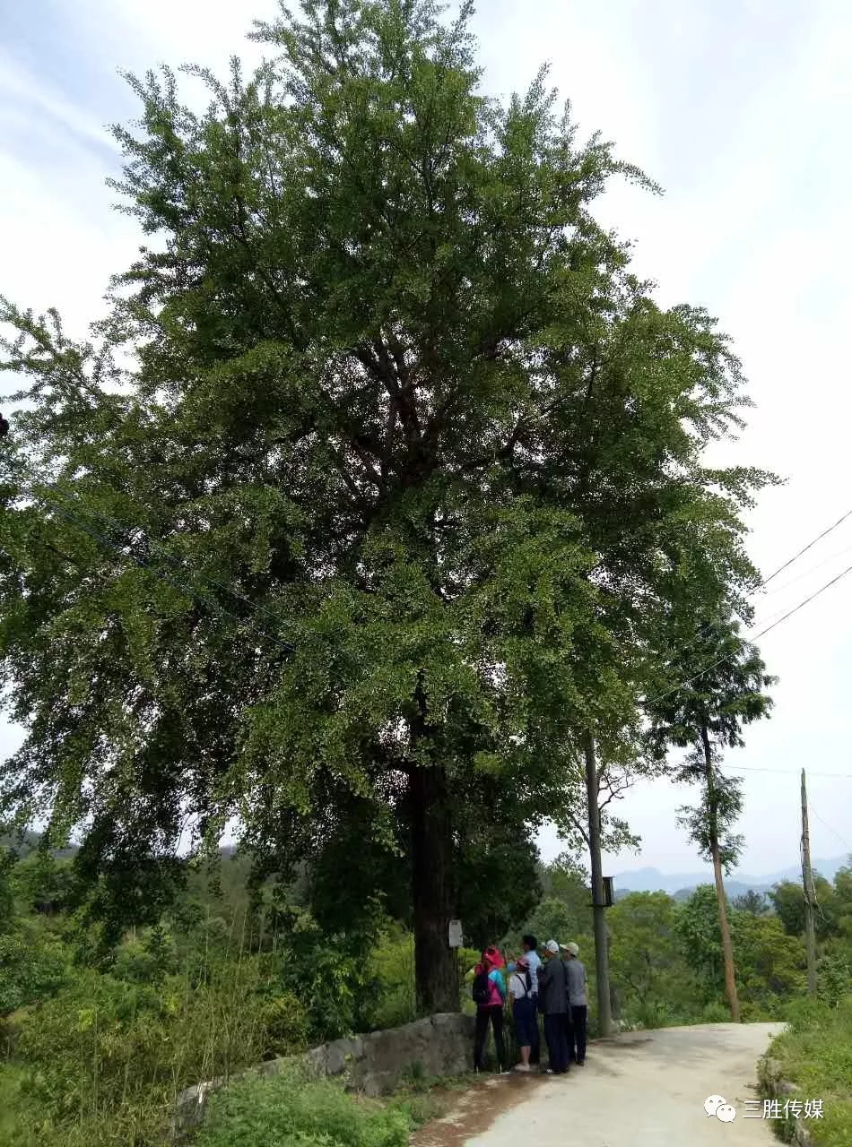 沿着新修的水泥路,一行人步行约300余米,只见屹立在村头的一棵古银杏树,绿意盎然的在风中招展,像是余家塆的迎宾者,迎接着到访的来客,树杆上挂着牌子,介绍此树的来历。