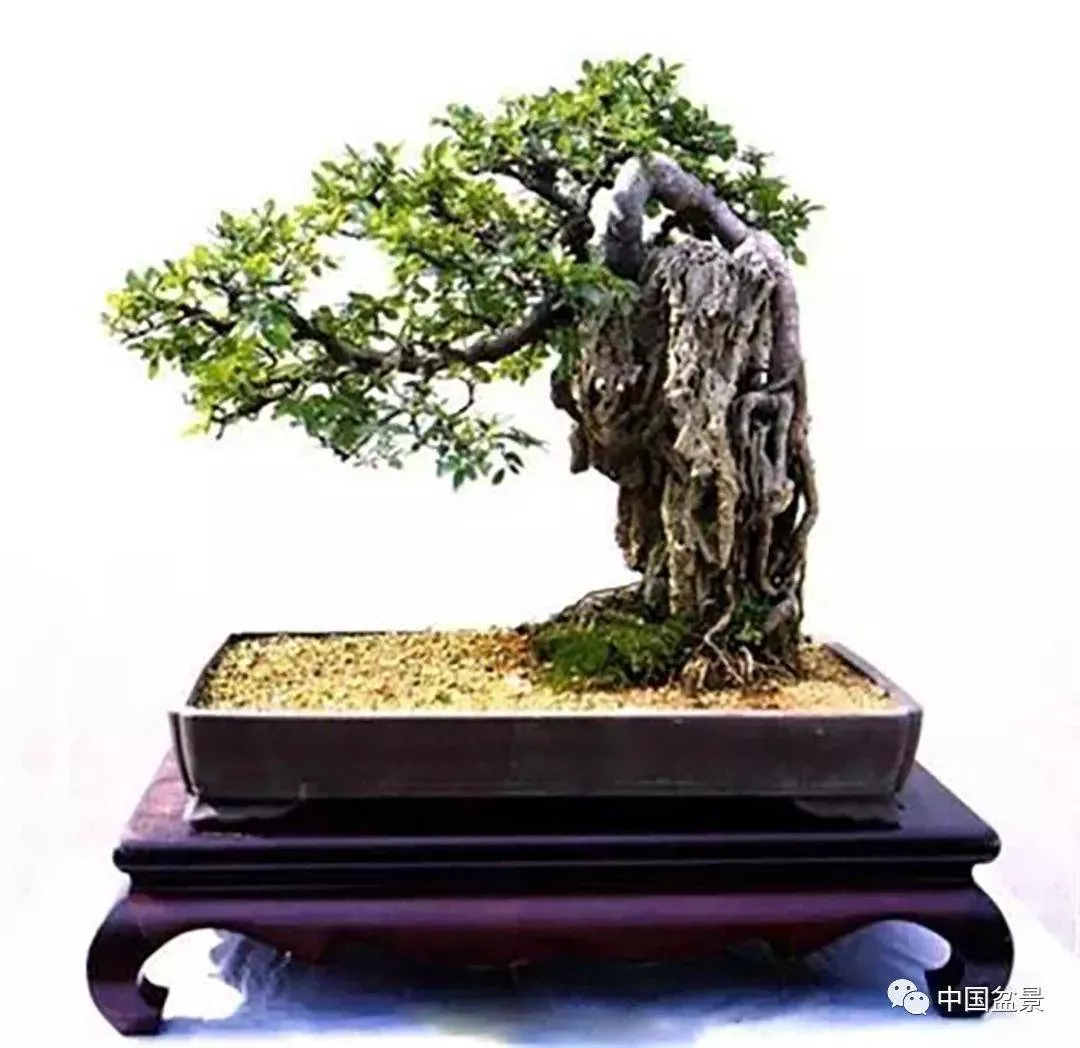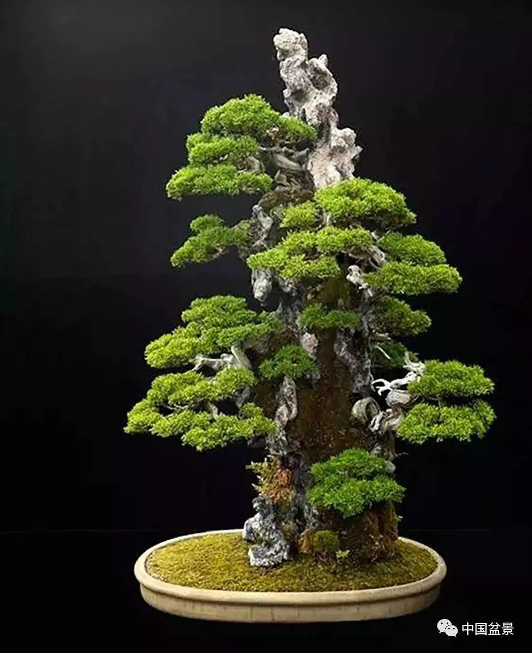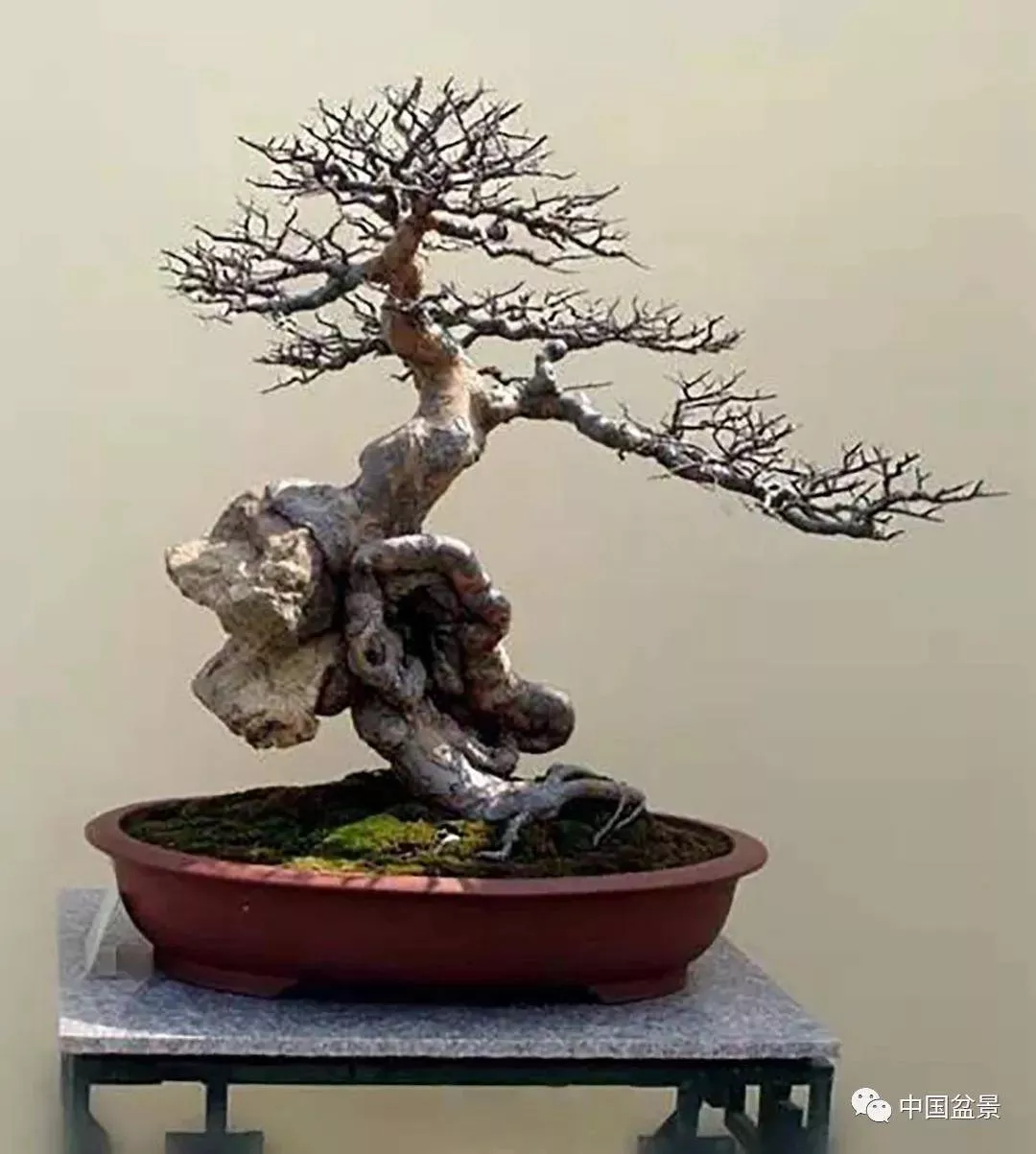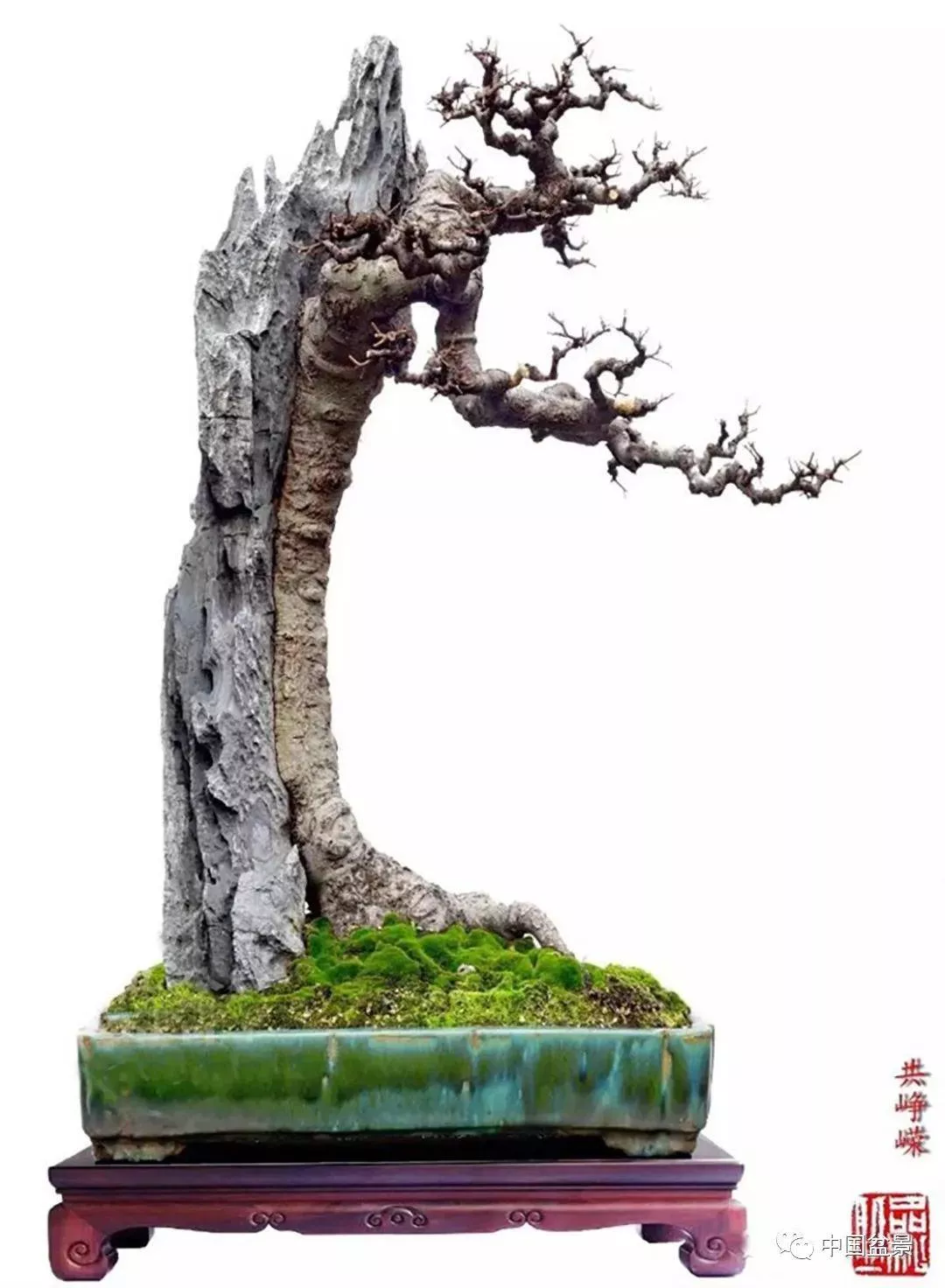 附石盆景,将树桩盆景与山水盆景有机融合在一起,是顽强生长绝壁悬崖石隙或峰峦岩巅的树木形象的缩影和特写。