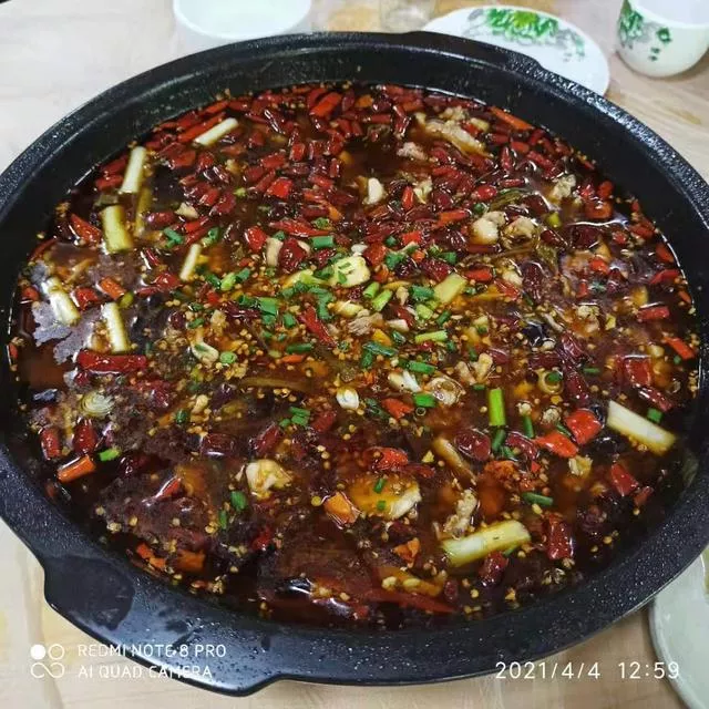 咽了一个小时的口水,总算是排到轮子了。一个大铁锅,红的辣椒、绿的葱段、滚烫的菜油、白嫩的兔肉、扑鼻的香味,满满当当,全是干货。就算只看这架势、只看这气派,也能猜到是内外兼修、货真价实的正宗美味。
