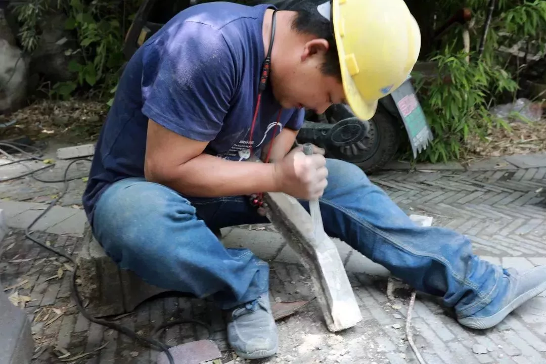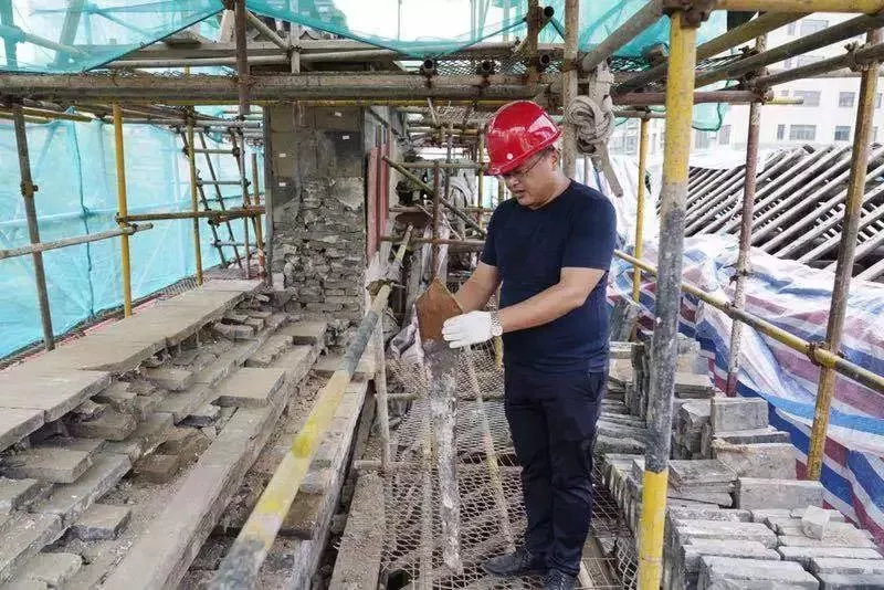 ●修缮中把2000多个构建逐一编号,用支架固定,小心翼翼慢慢剥离。剥离后的构件分门别类进行摆放,每一个构件通过工匠进行手工修复、精心打磨、粘合,再原位复原,对祠门上的细碎砖石也进行收集粘合。