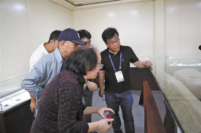孙周勇(右一)与专家分析“皇城台”出土的石雕。陕西省考古研究院供图