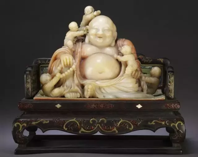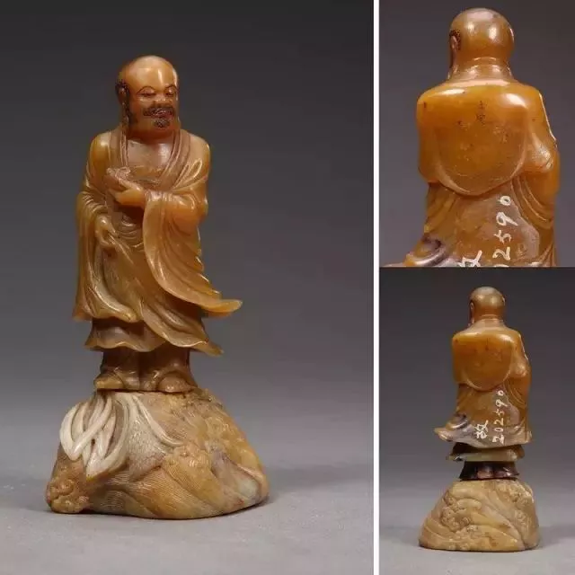 清代寿山石雕艺术的突出成就,亦表现在圆雕人物、特别是宗教人物上。故宫收藏的寿山石类文物中,佛教人物题材的藏品占很大比例,其中又以罗汉像最为常见,也最具特点。其次为达摩、观音、弥勒等等。这些作品或出自内务府造办处御用工匠之手,或出自当时颇有名望的寿山石雕名家之手,如杨璇、周彬、魏开通、魏汝奋等。他们的作品各具特色,艺术水平极高,有的作品上镌刻着他们的姓名,为我们了解和欣赏清代顶级寿山石雕刻家的工艺水平,提供了翔实可靠的资料。