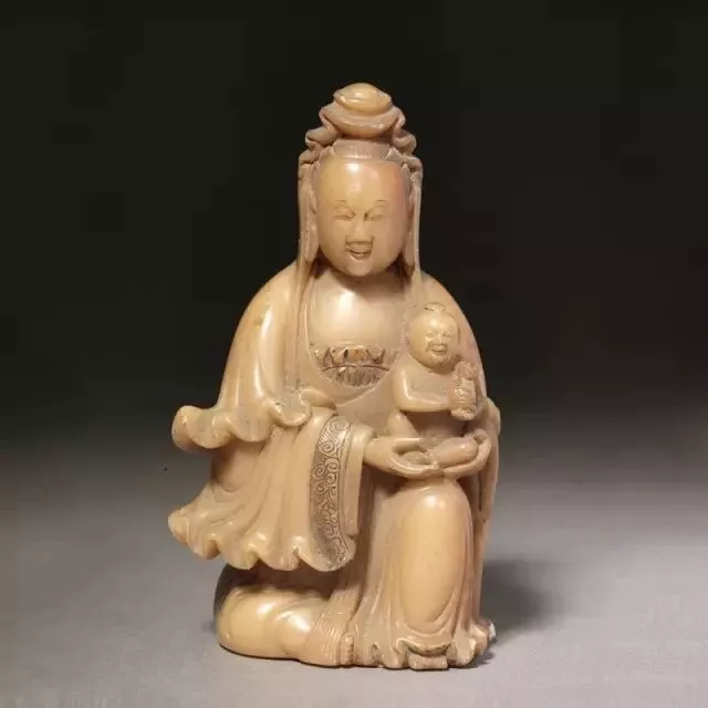 造像整体呈黄色,局部有少许粉色,细腻温润,色泽古朴。圆雕观音像,神态慈祥,盘膝而坐,左腿曲起,双手扶坐一小童于膝上。双肩披风和袖摆下边陲卷,袖口阴刻云纹,衣纹流畅,雕刻精细。