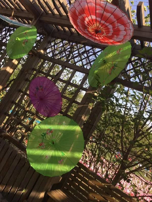 阳光照进长廊里,油纸伞闪闪发光。油纸伞的图案,都在彰显中国文化的博大精深。同时油纸伞的寓意代表着多子多福(与“有子”谐音),也是爱情的符号(《白蛇传》的许仙与白素贞,戴望舒的《雨巷》),伞骨为竹,也代表着节节高升,同时也代表着美好、圆满