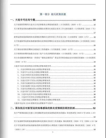 1.大连市司法局制作疫情防控电子书《新冠肺炎(NCP)疫情防控期间相关政策依据及法律问题指引》,内容包括省市相关部门优惠政策和便民措施、各部门热线电话、汇总疫情相关法律法规以及复工问答等法律指引。《指引》梳理了企业和职工关心的劳动合同、权益保护、民商事合同履行等问题,并对疫情防控期间的劳动人事管理问题,节后延期复工及工资发放,企业间合同问题等一一解答。电子书推出首日就获得10万多人次阅读量,受到社会各界广泛好评。