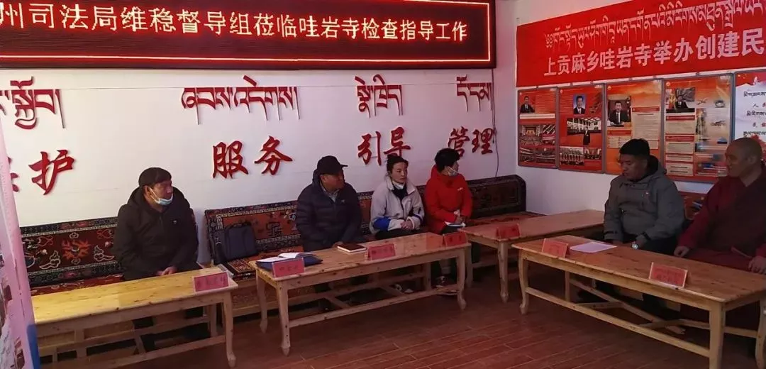 期间督导组前往玛沁县司法局、甘德县司法局听取汇报,并对大武镇、拉加镇司法所、拉日寺、江让寺、拉加寺,上贡麻司法所、岗龙司法所、哇岩寺、东吉多卡寺、龙什加寺、多利多卡寺及龙恩寺进行“法律进寺院”活动开展情况进行督导检查。上贡麻、岗龙乡政府主要领导就三月维稳期间工作和司法行政工作进行了专题汇报。通过听取汇报、查阅资料、座谈交流、实地查看等方式详细了解重点人员管控、矛盾纠纷排查化解、法治宣传、扫黑除恶、公共法律服务、法治政府、疫情防控以及中央、省委一号文件宣讲等重点工作开展情况。