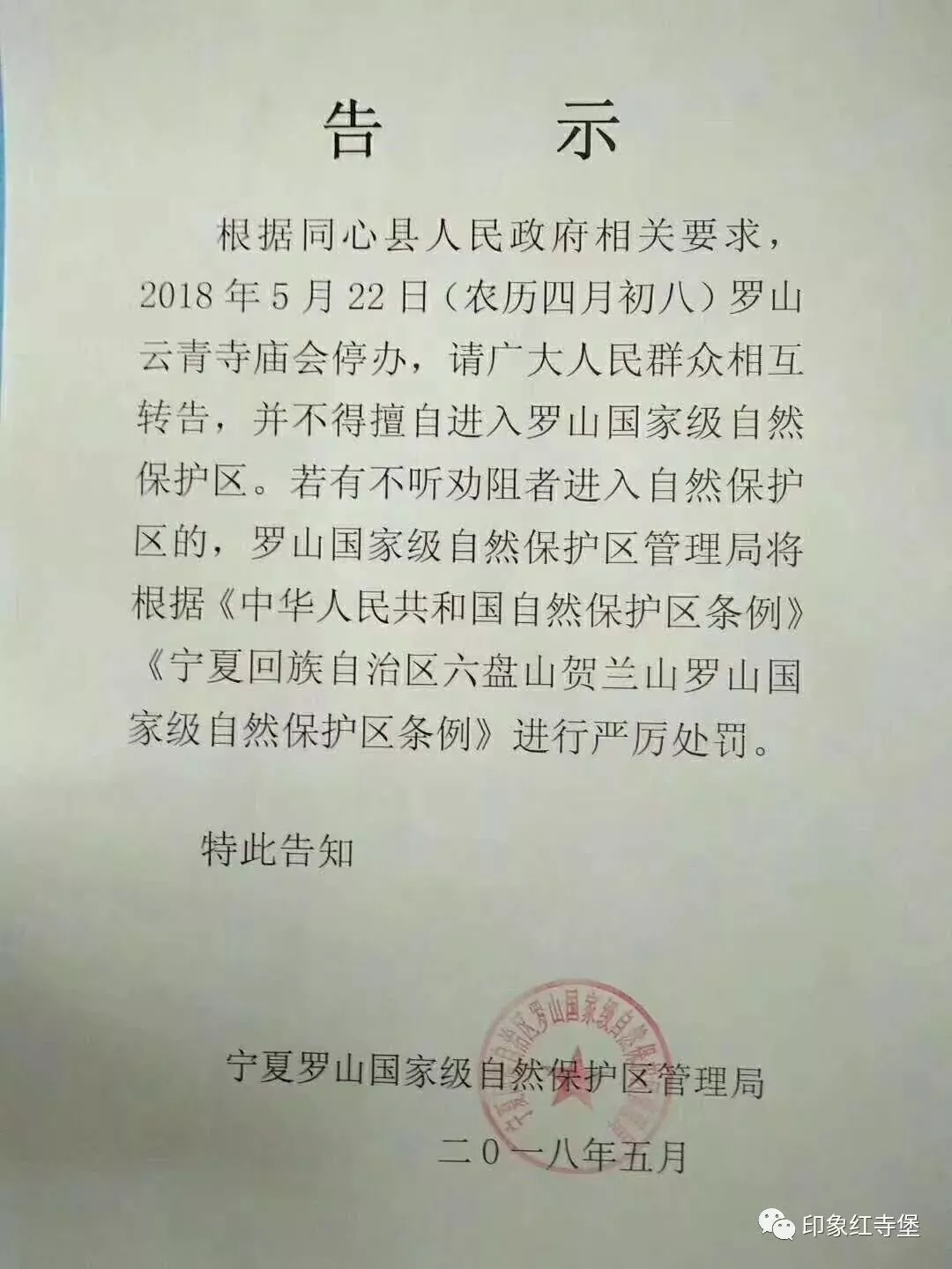 根据同心县人民政府相关要求,2018年5月22日(农历四月初八)罗山云青寺庙会停办,请广大人民群众相互转告,并不得擅自进入罗山国家级自然保护区。若有不听劝阻者进入自然保护区的,罗山国家级自然保护区管理局将根据《中华人民共和国自然保护区条例》、《宁夏回族自治区六盘山贺兰山罗山国家级自然保护区条例》进行严厉处罚。